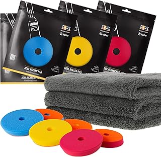 ADBL Polierschwamm 9er Set: Profi Polierpads 125mm mit Loch für DA Exzenter Poliermaschinen: 2X Hard Cut blau - 2X Polish gelb - 2X Soft Polish Rot + 3X Shiny Freaks Mikrofasertuch grau