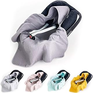 BABEES Einschlagdecke Kapuze Waffelstoff Baumwolle Waffelpiqué für Babyschale Autositz, Universal z.B. Maxi-Cosi Römer Cybex, Frühling Sommer Baby Decke für Kinderwagen Babytragen leicht (GRAU)